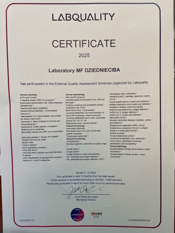 MFD Laboratory is accredited laboratory that performs clinical chemistry, hematology, immunohematology, immunology, cytology, histology and various types of clinical tests, using internationally recognized methods and reagents that are officially certified and registered in accordance with the existing legislation of the Republic of Latvia. Laboratory activities are organized and managed in accordance with the CM Regulations No. 60 "Regulations on obligatory requirements for medical institutions and their departments" (ISO 15189 standard).